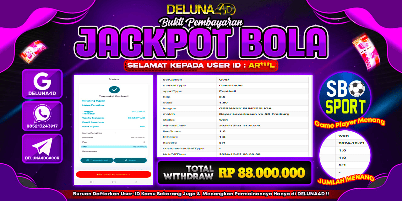 Selamat atas kemenangan User ID : AR***L, yang telah berhasil mendapatkan kemenangan di permainan SPORTBOOK SBO SPORT dengan kemenangan sebesar Rp 88.000.000,- . Setelah mengisi formulir withdraw, hanya dalam jangka waktu 3 – 5 menitan tim layanan pelanggan DELUNA4D telah berhasil menegirimkan semua saldo kemenangan ke User ID tersebut.