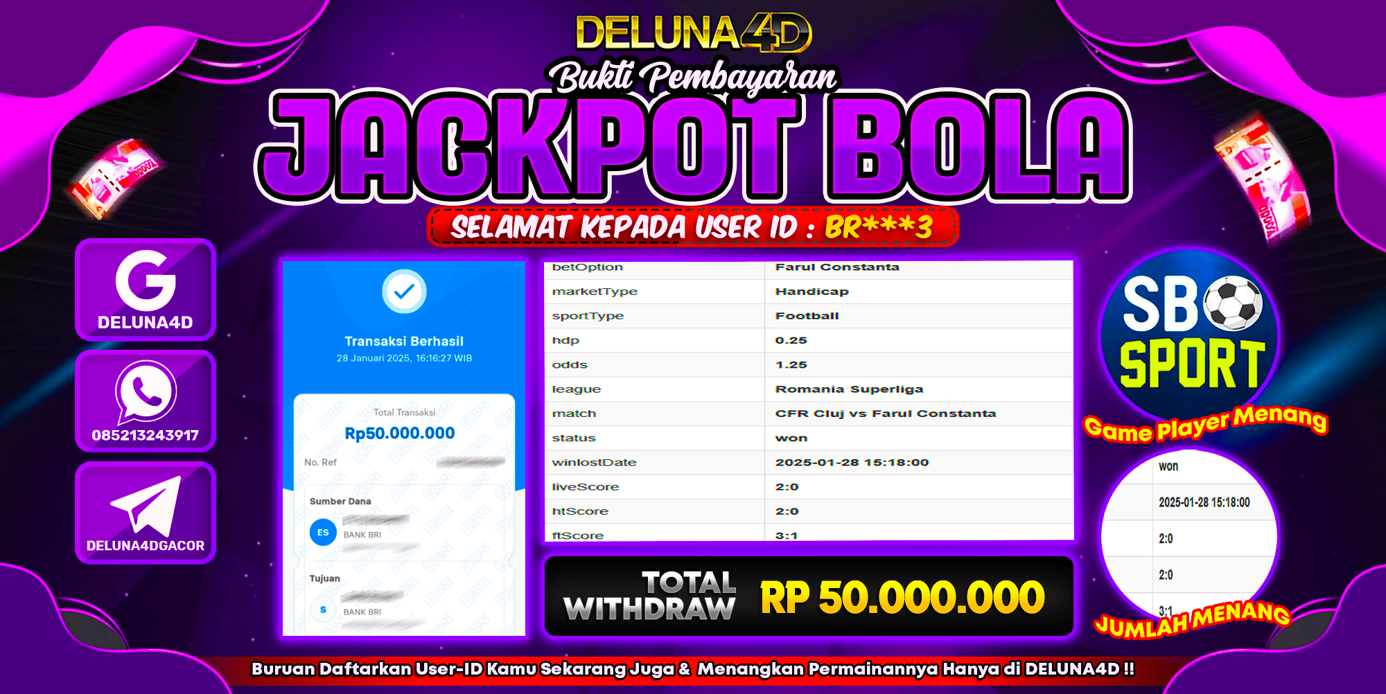 Selamat atas kemenangan User ID : BR***3, yang telah berhasil mendapatkan kemenangan di permainan SPORTBOOK SBO SPORT dengan kemenangan sebesar Rp50.000.000,- . Setelah mengisi formulir withdraw, hanya dalam jangka waktu 3 – 5 menitan tim layanan pelanggan DELUNA4D telah berhasil mengirimkan semua saldo kemenangan ke User ID tersebut.