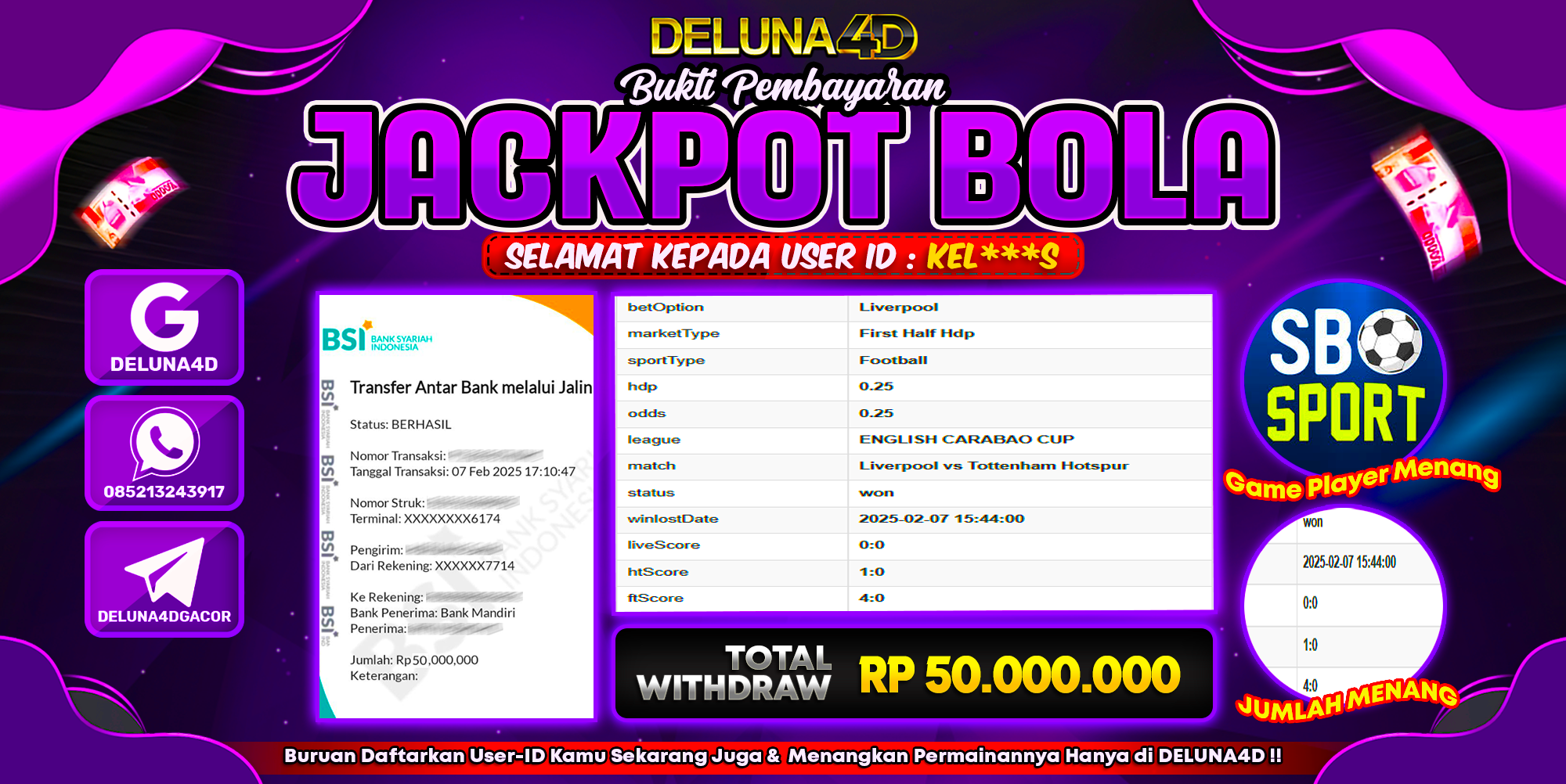 Selamat atas kemenangan User ID : KEL***S, yang telah berhasil mendapatkan kemenangan di permainan SPORTBOOK SBO SPORT dengan kemenangan sebesar Rp50.000.000,- . Setelah mengisi formulir withdraw, hanya dalam jangka waktu 3 – 5 menitan tim layanan pelanggan DELUNA4D telah berhasil mengirimkan semua saldo kemenangan ke User ID tersebut.