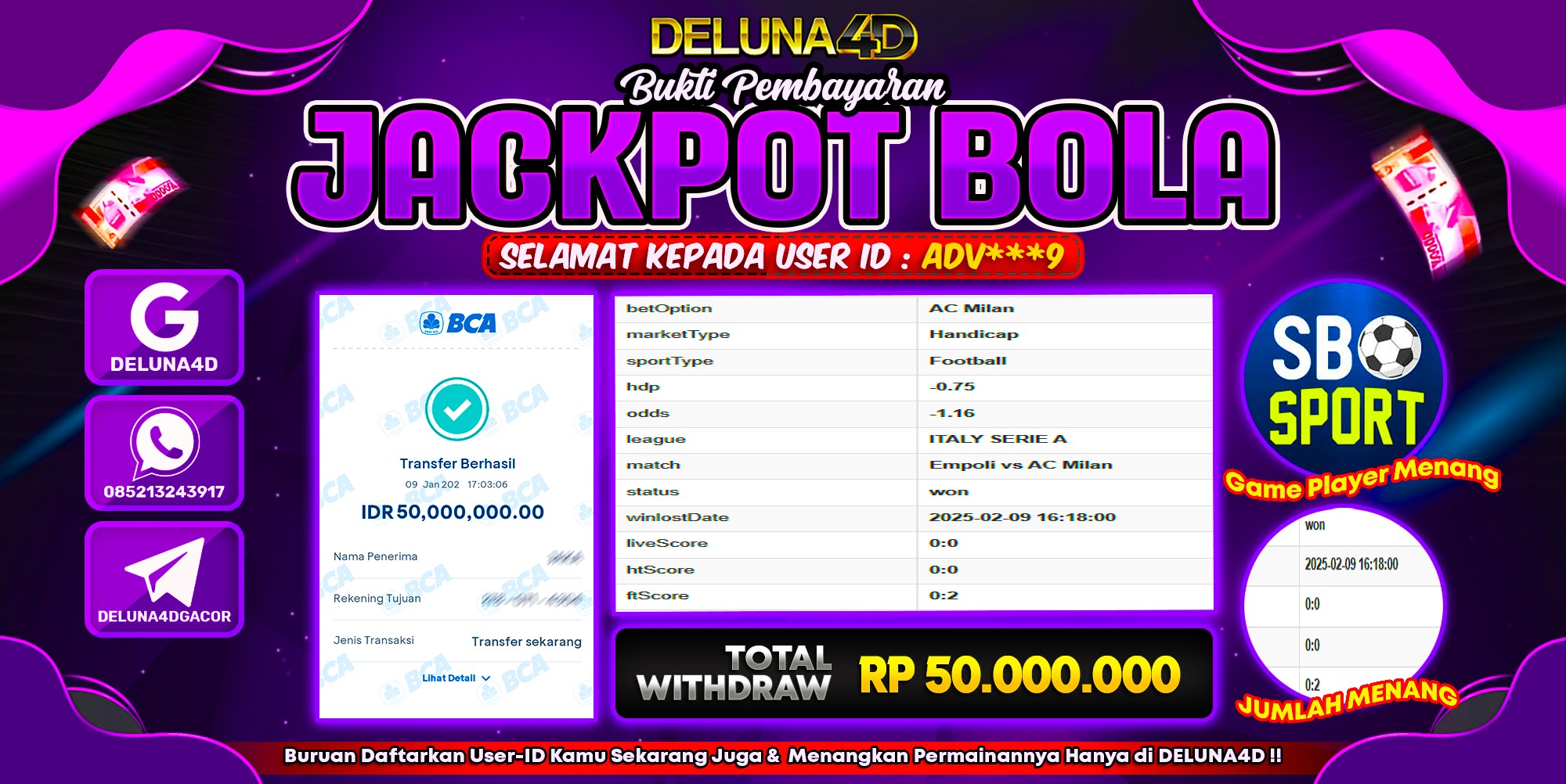 Selamat atas kemenangan User ID : ADV***9, yang telah berhasil mendapatkan kemenangan di permainan SPORTBOOK SBO SPORT dengan kemenangan sebesar Rp50.000.000,- . Setelah mengisi formulir withdraw, hanya dalam jangka waktu 3 – 5 menitan tim layanan pelanggan DELUNA4D telah berhasil mengirimkan semua saldo kemenangan ke User ID tersebut.