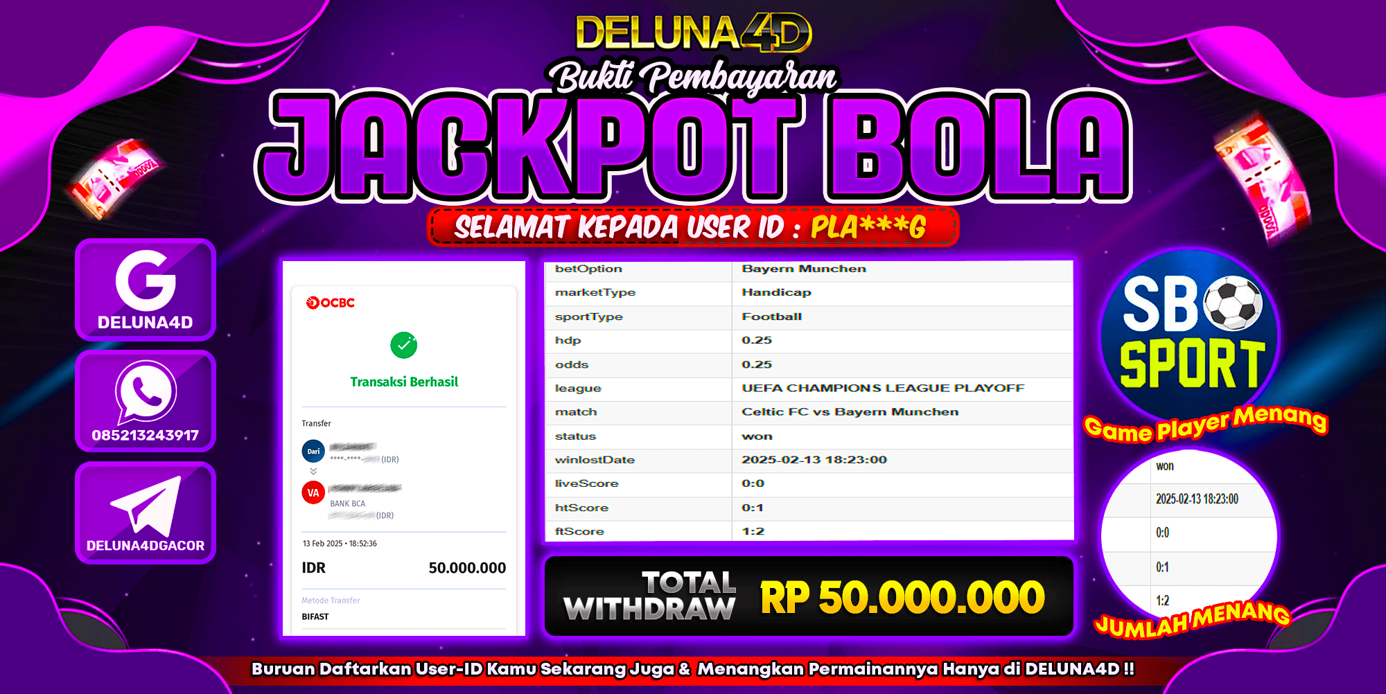 Selamat atas kemenangan User ID : PLA***G, yang telah berhasil mendapatkan kemenangan di permainan SPORTBOOK SBO SPORT dengan kemenangan sebesar Rp50.000.000,- . Setelah mengisi formulir withdraw, hanya dalam jangka waktu 3 – 5 menitan tim layanan pelanggan DELUNA4D telah berhasil mengirimkan semua saldo kemenangan ke User ID tersebut.