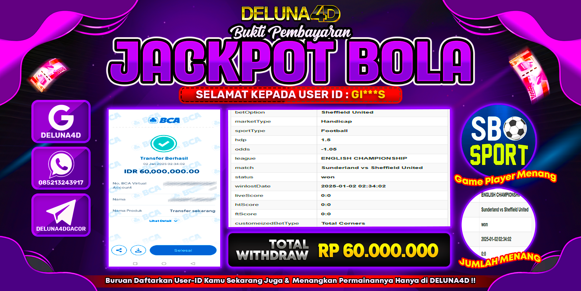DELUNA4D JACKPOT SPORTBOOK SBO SPORT Rp60.000.000.,- LUNAS