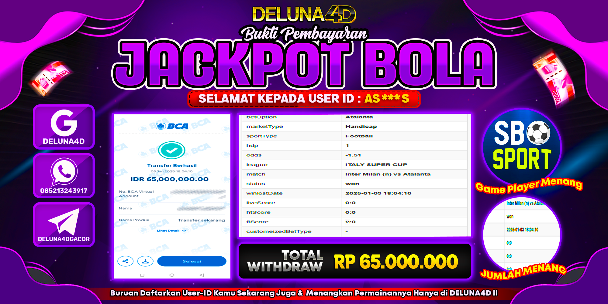 Selamat atas kemenangan User ID : AS***S, yang telah berhasil mendapatkan kemenangan di permainan SPORTBOOK SBO SPORT dengan kemenangan sebesar Rp 65.000.000,- . Setelah mengisi formulir withdraw, hanya dalam jangka waktu 3 – 5 menitan tim layanan pelanggan DELUNA4D telah berhasil mengirimkan semua saldo kemenangan ke User ID tersebut.