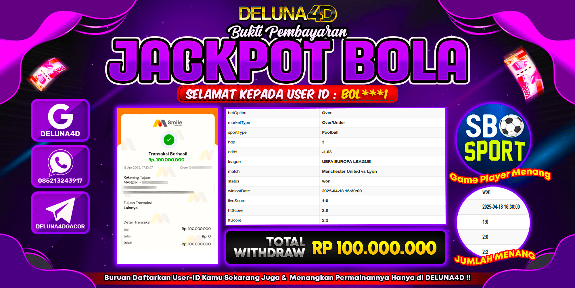 DELUNA4D JACKPOT SPORTBOOK SBO SPORTS Rp100.000.000,- LUNAS