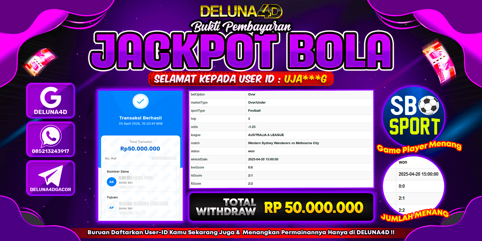 Selamat atas kemenangan User ID : UJA***G, yang telah berhasil mendapatkan kemenangan di permainan SPORTBOOK SBO SPORTS dengan kemenangan sebesar Rp50.000.000,- . Setelah mengisi formulir withdraw, hanya dalam jangka waktu 3 – 5 menitan tim layanan pelanggan DELUNA4D telah berhasil mengirimkan semua saldo kemenangan ke User ID tersebut.