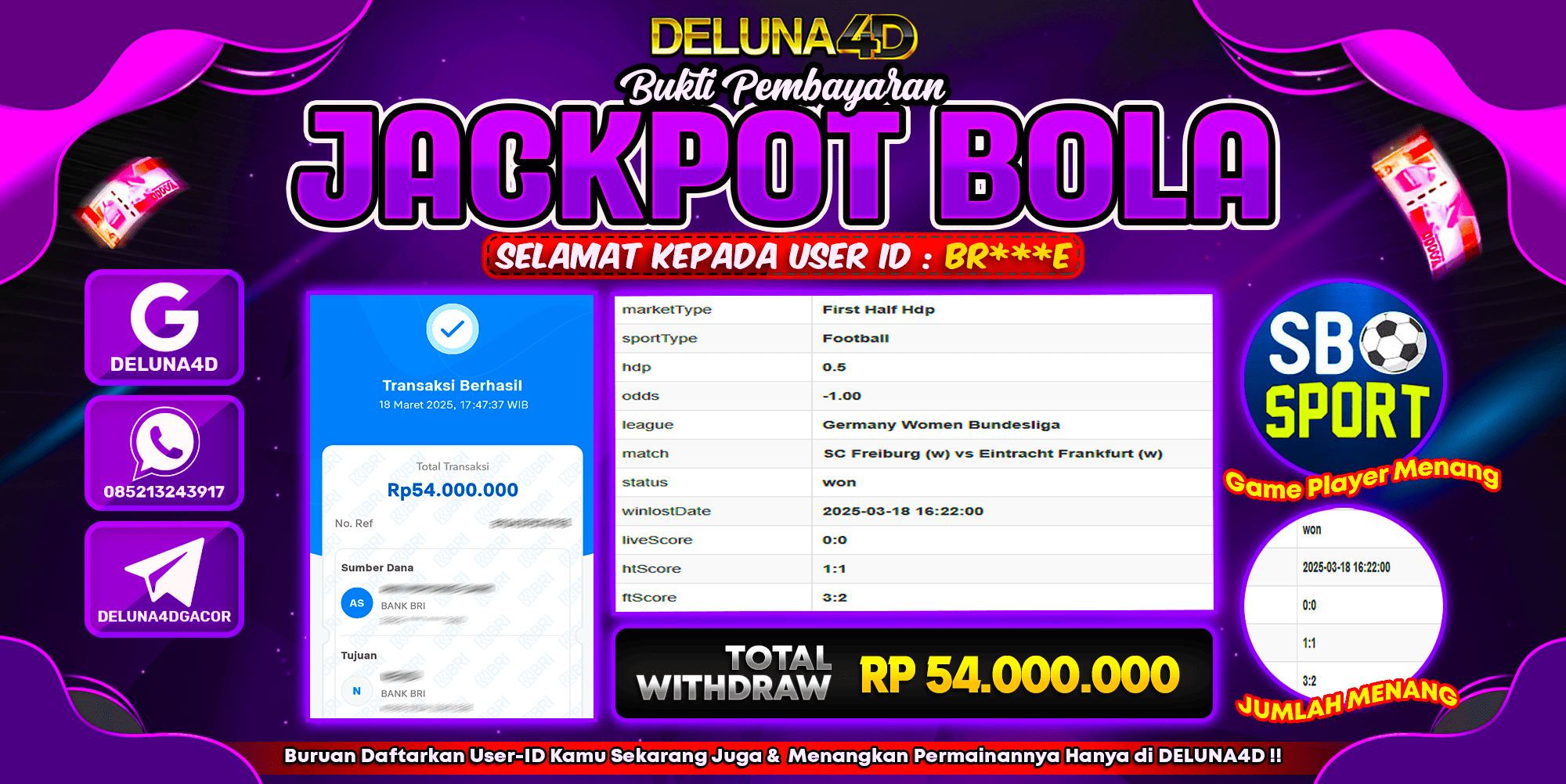 Selamat atas kemenangan User ID : BR***E, yang telah berhasil mendapatkan kemenangan di permainan SPORTBOOK SBO SPORTS dengan kemenangan sebesar Rp54.000.000,- . Setelah mengisi formulir withdraw, hanya dalam jangka waktu 3 – 5 menitan tim layanan pelanggan DELUNA4D telah berhasil mengirimkan semua saldo kemenangan ke User ID tersebut.