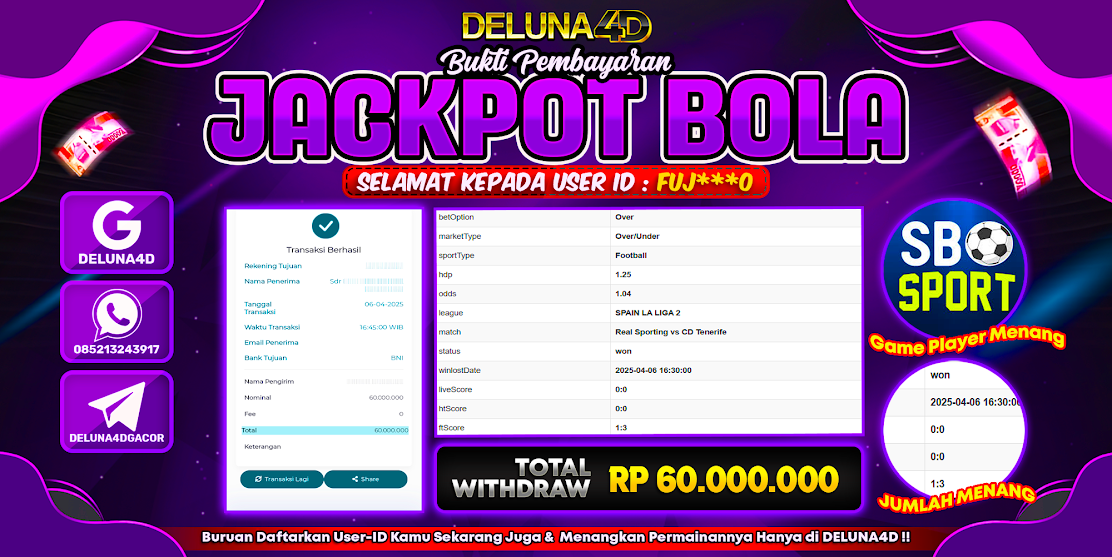Selamat atas kemenangan User ID : FUJ***O, yang telah berhasil mendapatkan kemenangan di permainan SPORTBOOK SBO SPORTS dengan kemenangan sebesar Rp60.000.000,- . Setelah mengisi formulir withdraw, hanya dalam jangka waktu 3 – 5 menitan tim layanan pelanggan DELUNA4D telah berhasil mengirimkan semua saldo kemenangan ke User ID tersebut.