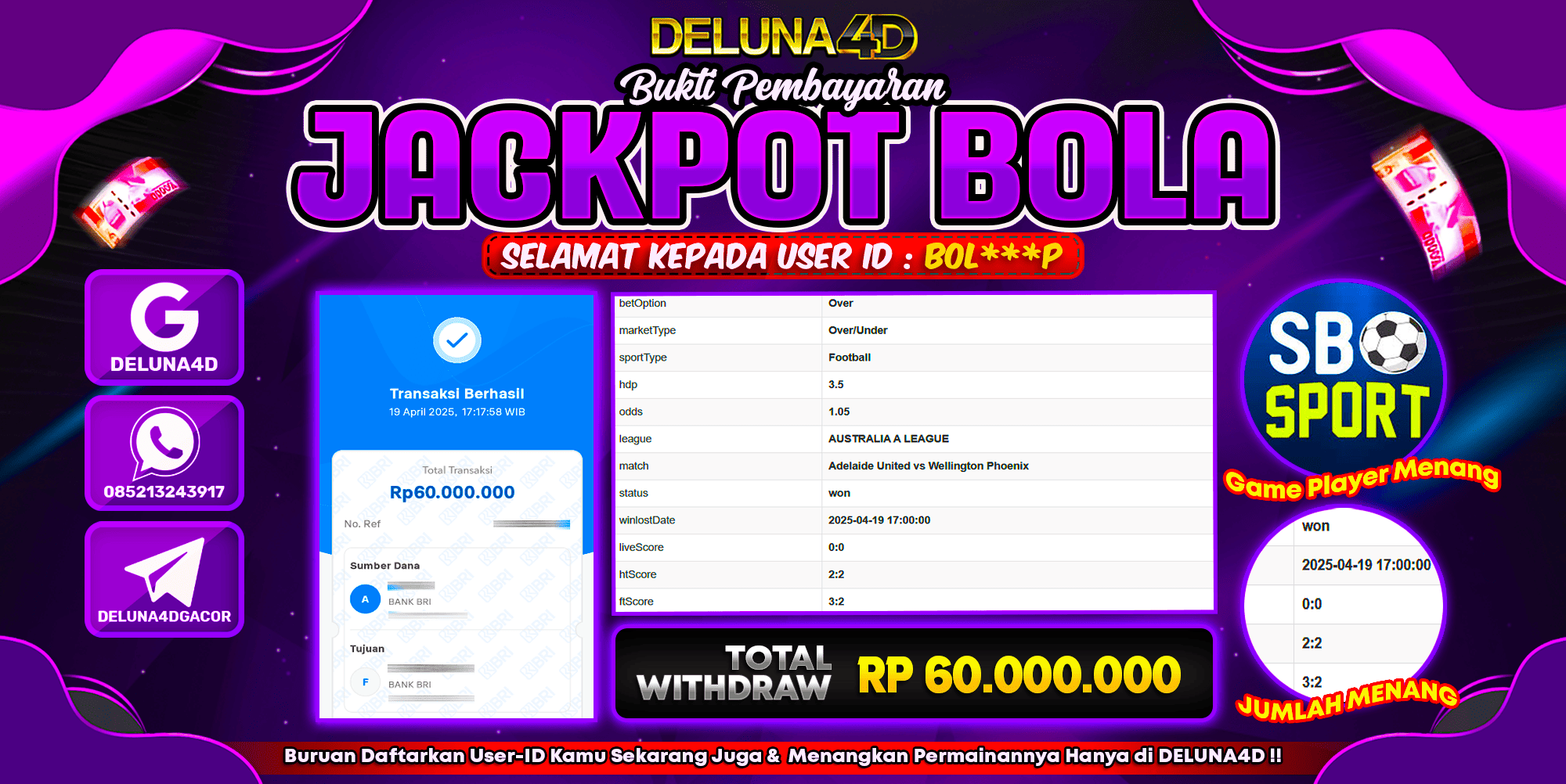 Selamat atas kemenangan User ID : BOL***P, yang telah berhasil mendapatkan kemenangan di permainan SPORTBOOK SBO SPORTS dengan kemenangan sebesar Rp60.000.000,- . Setelah mengisi formulir withdraw, hanya dalam jangka waktu 3 – 5 menitan tim layanan pelanggan DELUNA4D telah berhasil mengirimkan semua saldo kemenangan ke User ID tersebut.
