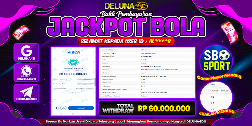 Selamat atas kemenangan User ID : AL****8, yang telah berhasil mendapatkan kemenangan di permainan SPORTBOOK SBO SPORTS dengan kemenangan sebesar Rp60.000.000,- . Setelah mengisi formulir withdraw, hanya dalam jangka waktu 3 – 5 menitan tim layanan pelanggan DELUNA4D telah berhasil mengirimkan semua saldo kemenangan ke User ID tersebut.