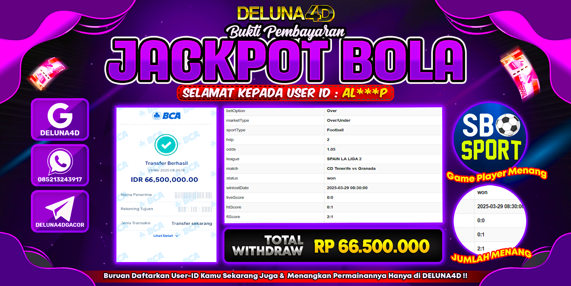 Selamat atas kemenangan User ID : AL***P, yang telah berhasil mendapatkan kemenangan di permainan SPORTBOOK SBO SPORTS dengan kemenangan sebesar Rp66.500.000,- . Setelah mengisi formulir withdraw, hanya dalam jangka waktu 3 – 5 menitan tim layanan pelanggan DELUNA4D telah berhasil mengirimkan semua saldo kemenangan ke User ID tersebut.