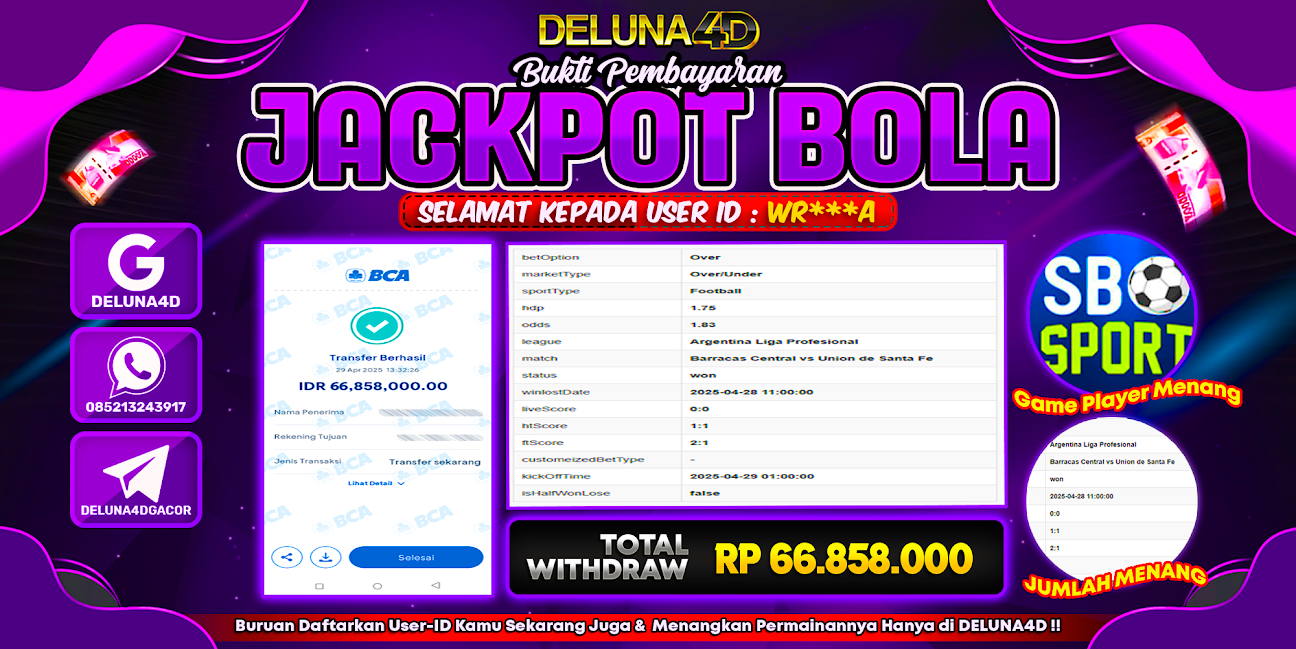 Selamat atas kemenangan User ID : WR***A, yang telah berhasil mendapatkan kemenangan di permainan SPORTBOOK SBO SPORTS dengan kemenangan sebesar Rp66.858.000,- . Setelah mengisi formulir withdraw, hanya dalam jangka waktu 3 – 5 menitan tim layanan pelanggan DELUNA4D telah berhasil mengirimkan semua saldo kemenangan ke User ID tersebut.