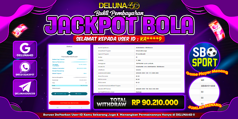 Selamat atas kemenangan User ID : KA****9, yang telah berhasil mendapatkan kemenangan di permainan SPORTBOOK SBO SPORTS dengan kemenangan sebesar Rp90.210.000,- . Setelah mengisi formulir withdraw, hanya dalam jangka waktu 3 – 5 menitan tim layanan pelanggan DELUNA4D telah berhasil mengirimkan semua saldo kemenangan ke User ID tersebut.