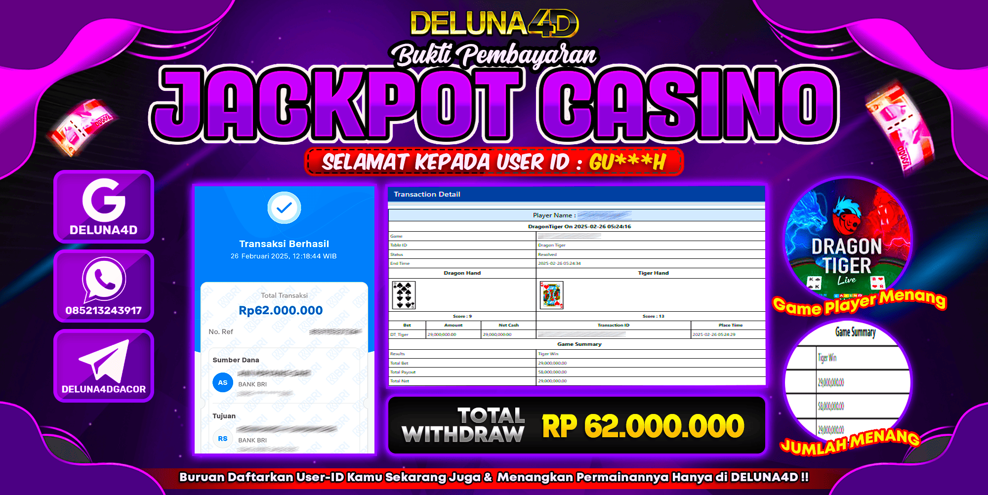 Selamat atas kemenangan User ID : GU***H, yang telah berhasil mendapatkan kemenangan di permainan LIVE CASINO PRAGMATIC DRAGON TIGER dengan kemenangan sebesar Rp62.000.000,- . Setelah mengisi formulir withdraw, hanya dalam jangka waktu 3-5 menitan tim layanan pelanggan DELUNA4D telah berhasil mengirimkan semua saldo kemenangan ke User ID tersebut.